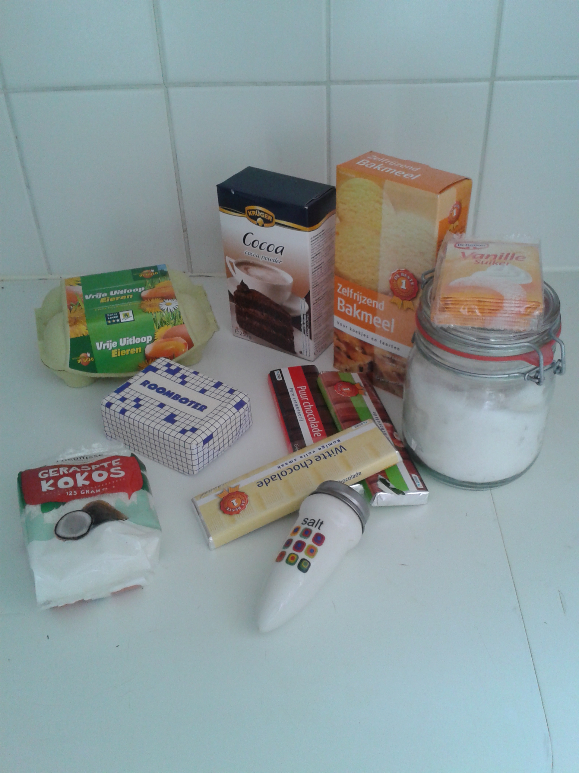 4. Haal de chocoladerepen uit de verpakking, zelf heb ik gekozen voor puur, wit en melk/hazelnoot, erg lekker! Snijd deze met een kartelmes in stukjes. Voeg de stukjes chocolade toe aan het mengsel en roeren maar.