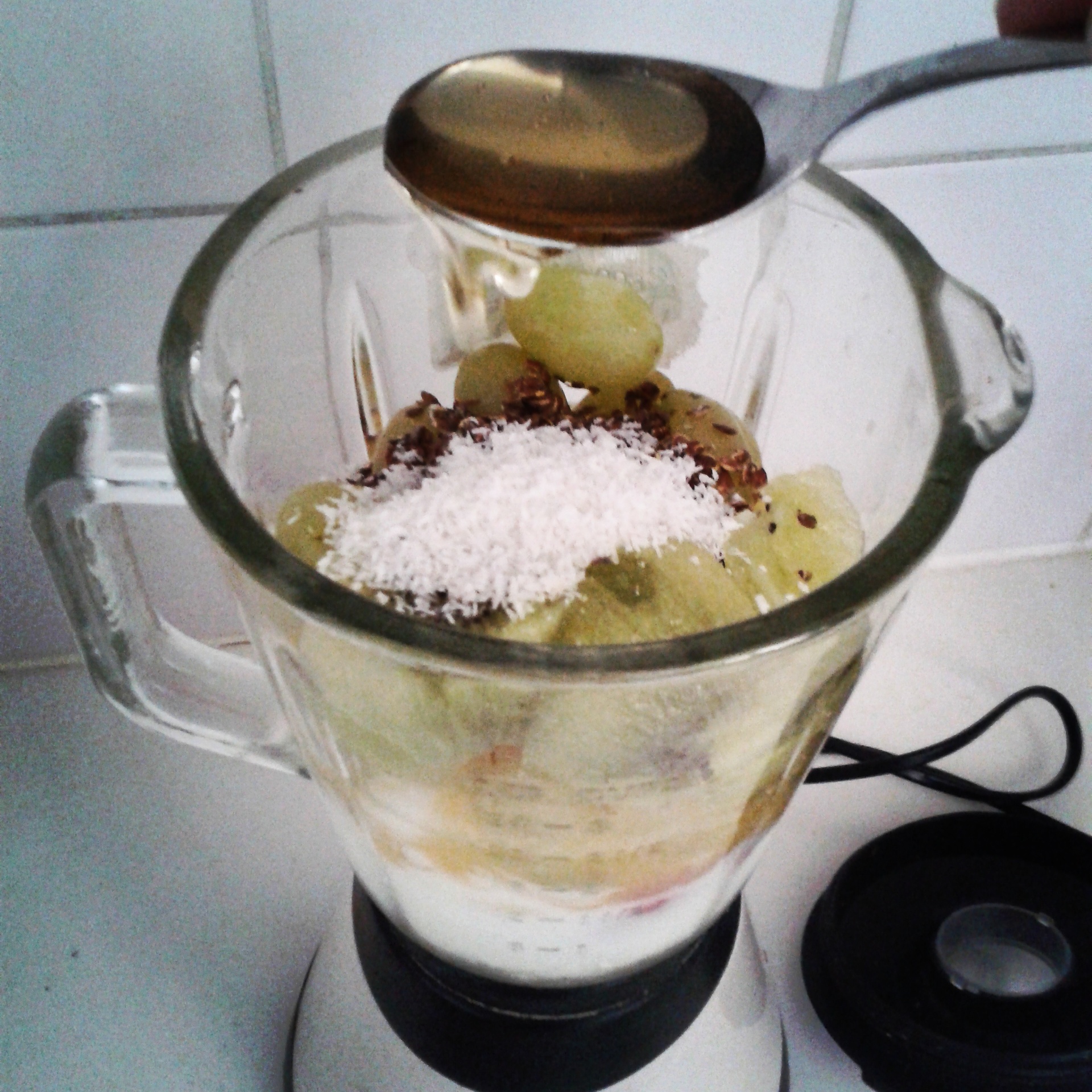 Zet de blender klaar. Zorg dat je fruit, yoghurt en wat raw food in huis hebt. De ingrediënten van deze smoothie kan je zelf invullen waardoor je eindeloos kunt variëren. Zelf heb ik vandaag aardbeien, banaan, druiven, kiwi en sinaasappels in huis en besluit dit aan de yoghurt toe te voegen. Tenslotte doe ik er 2 eetlepels lijnzaad, 1 eetlepel geraspte kokos en 1 eetlepel honing bij.