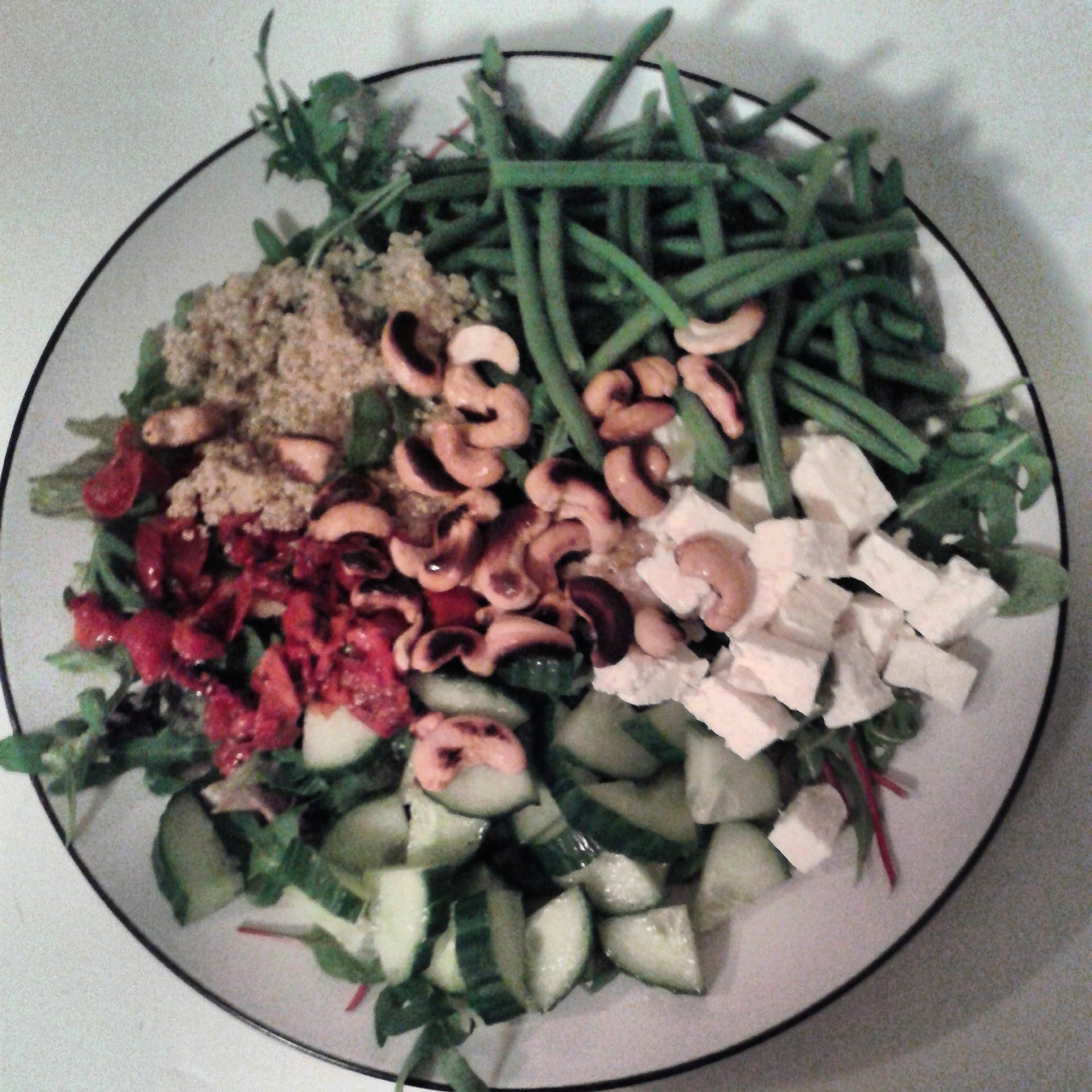 7. Giet de sperziebonen en quinoa af en leg alles op het bord bovenop de sla.