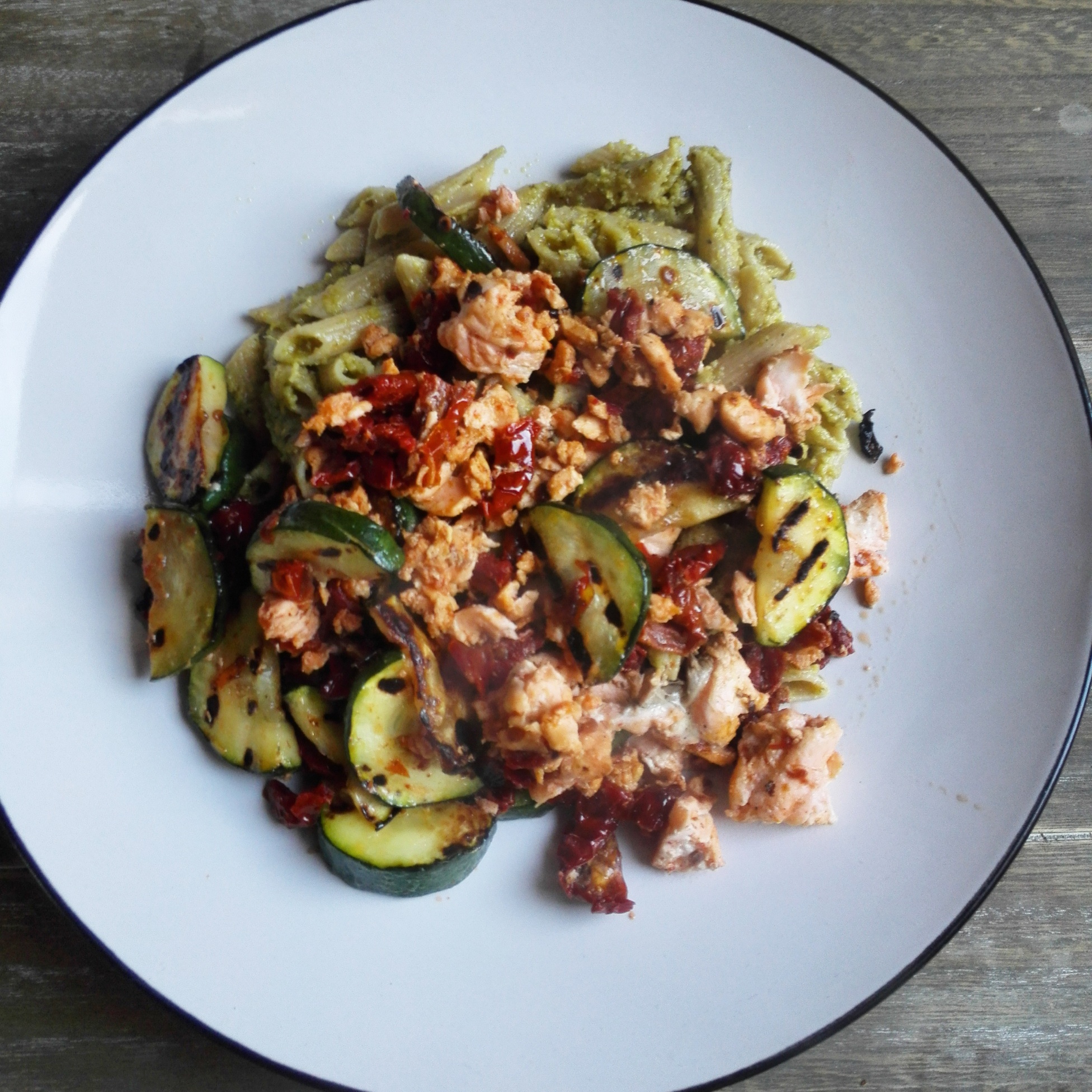 Kook ongeveer een halve liter in de waterkoker (scheelt een hoop wachten). Terwijl je hierop wacht snijd je de courgette in halve maantjes en de tomaten zo fijn mogelijk. Net wat je zelf lekker vindt natuurlijk! Doe de pasta met het kokende water in een pan op middelhoog vuur. Gebruik een grillplan voor de groenten en zalm en zet deze ook op middelhoog vuur. Gril eerst de courgette aan beide kanten tot er strepen zichtbaar zijn op de courgette. Voeg hier de zongedroogde tomaat aan toe en tot slot de zalm. Laat dit zo 5 minuten doorbakken en roer het af en toe even om. Giet de pasta af en roer de pesto erdoorheen. Leg alles op een groot bord en dit heerlijke gerecht kan gegeten worden.