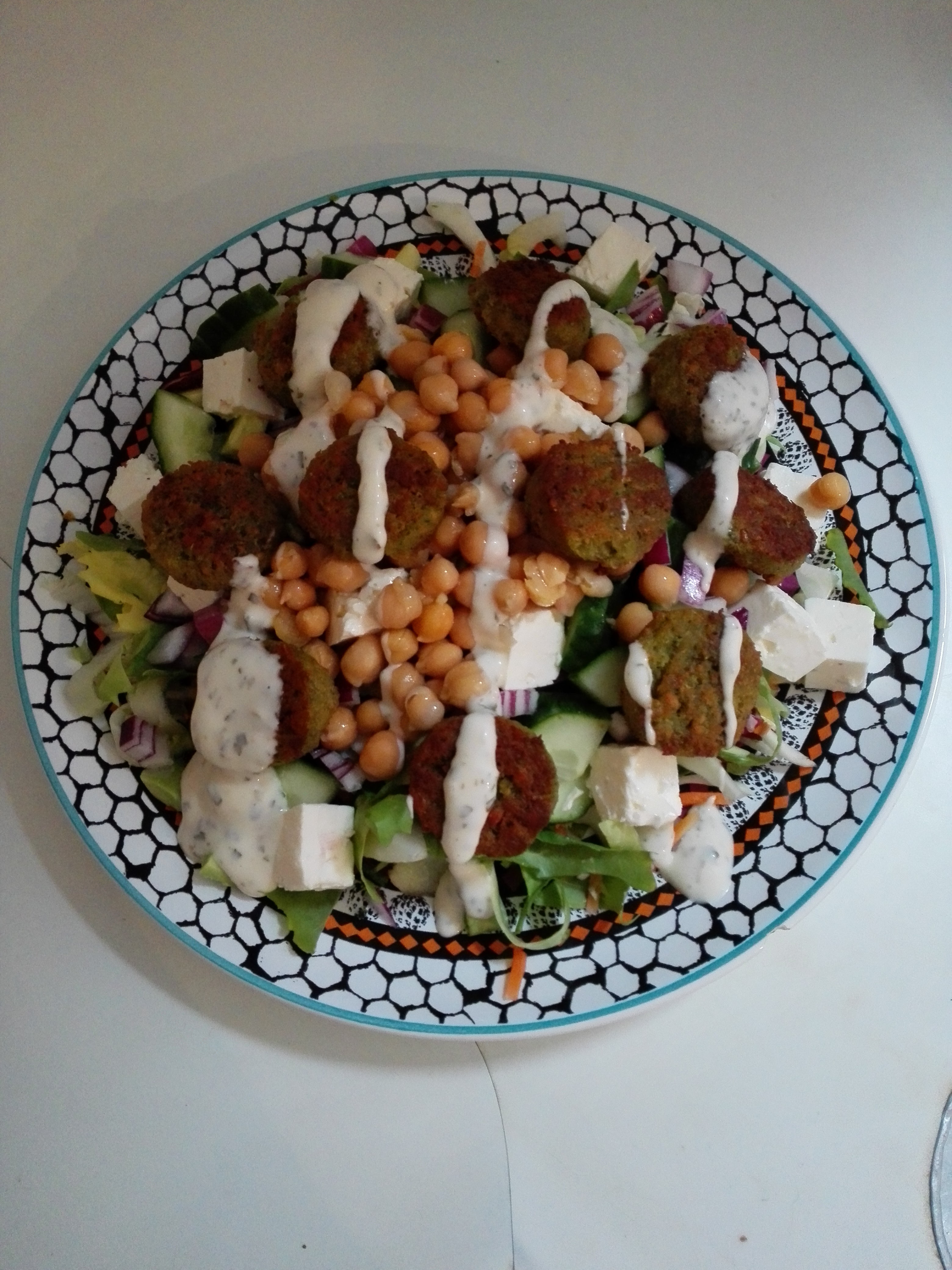 Het is heel eenvoudig te maken en aan de hand van hoeveel honger je hebt maak je een hoeveelheid klaar. Het is een kwestie van alles in stukjes snijden en de falafel met een scheutje olie bakken in de pan. Vervolgens kun je de salade serveren op een bord en er na smaak wat yoghurt dressing aan toevoegen. Eet smakelijk!