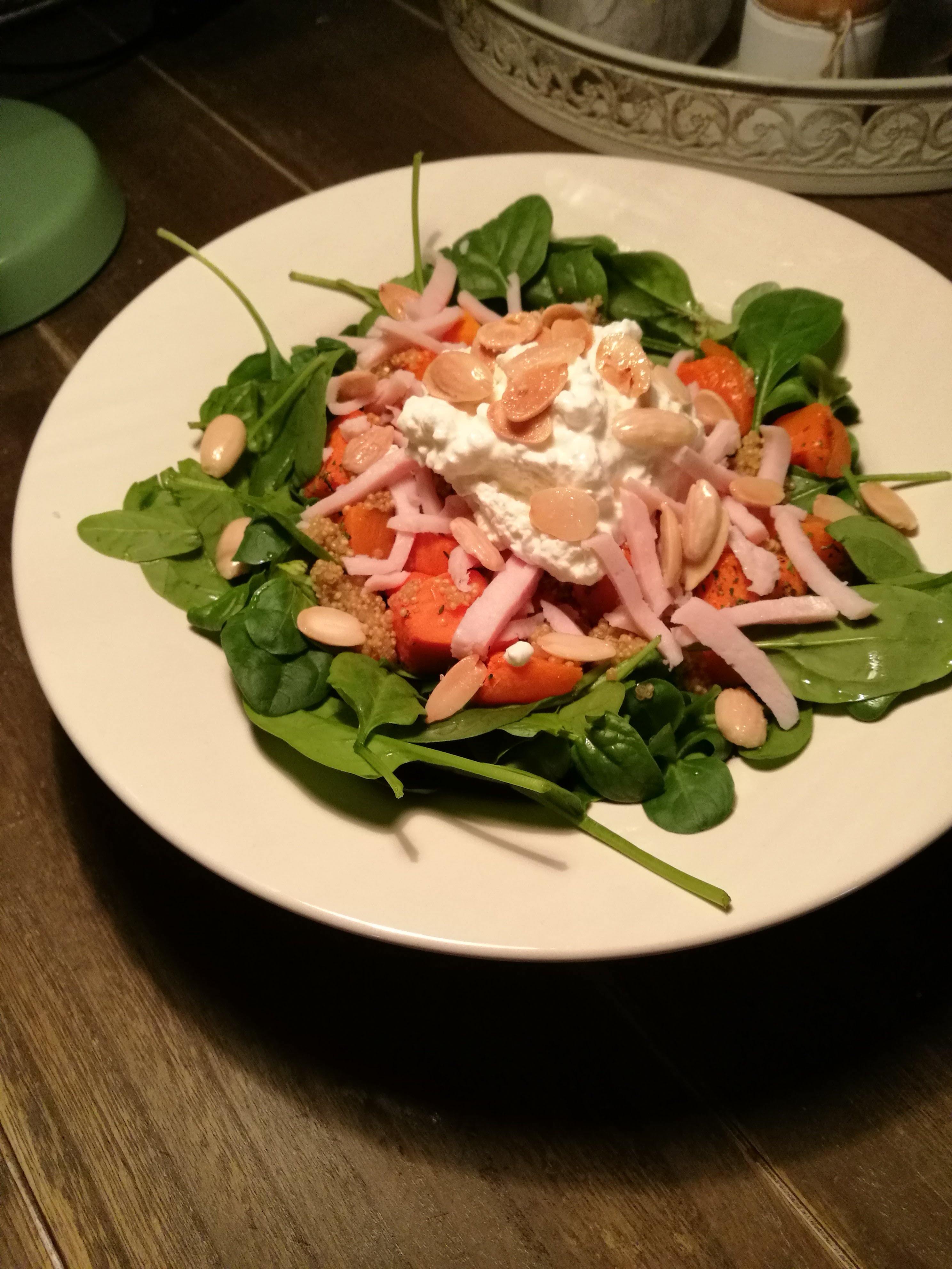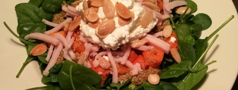 - Als de pompoen gaar is verdeel deze dan over de spinazie en voeg de quinoa, gerookte kip, Hüttenkäse en amandelen er aan toe.