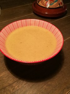 - Pureer de prei met een staafmixer en voeg al roerend de bloem toe zodat het niet gaat klonteren, anders even met de staafmixer pureren.