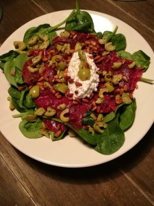 - Schep 2 eetlepels Hüttenkäse hierboven op en bestrooi tot slot de salade met pijnboompitten en olijven.