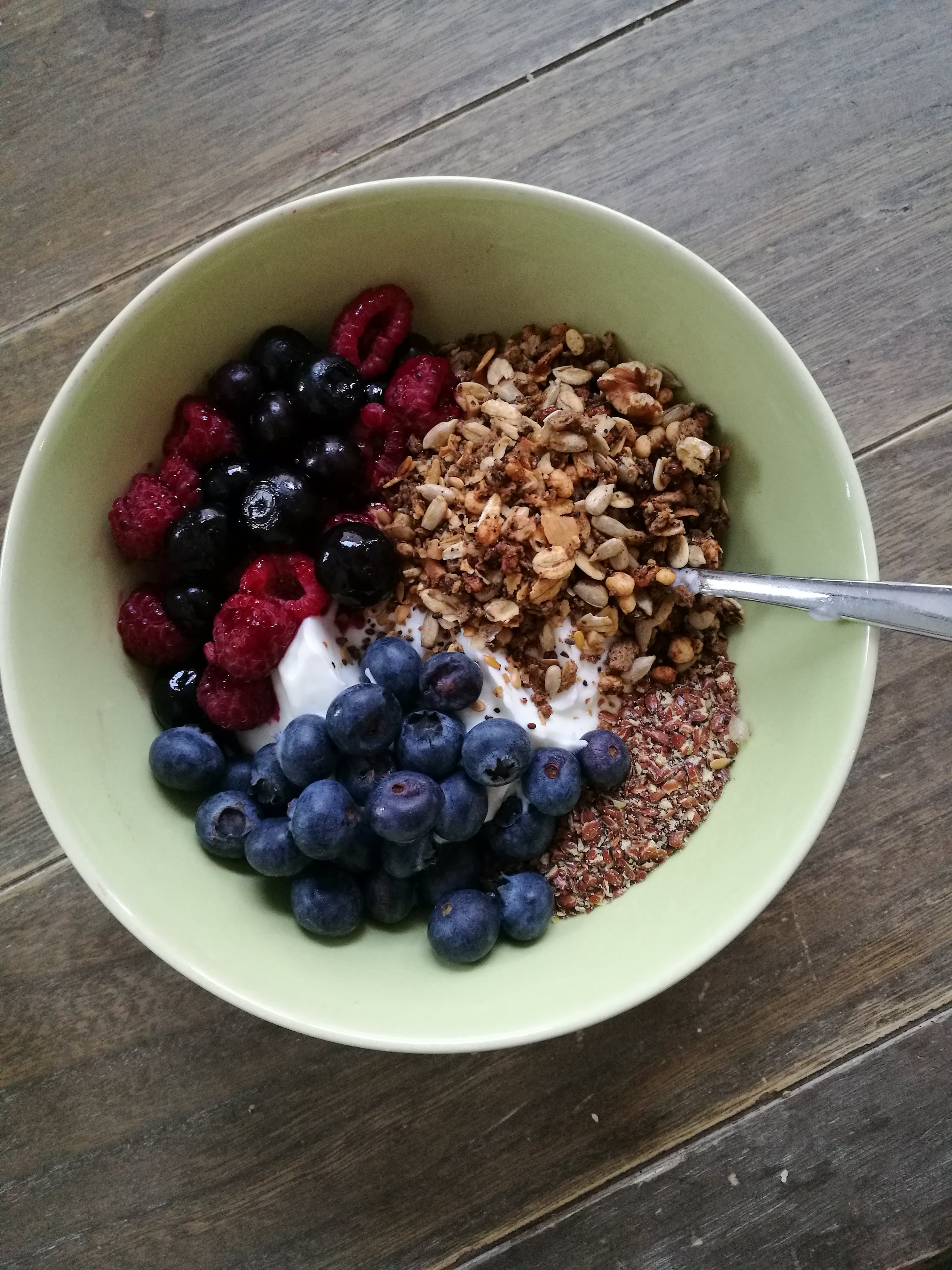 Mijn favoriete ontbijt bestaat uit zelfgemaakte granola, vers roodfruit, lijnzaad en kwark of Griekse yoghurt. Wat is jouw favoriete ontbijt?