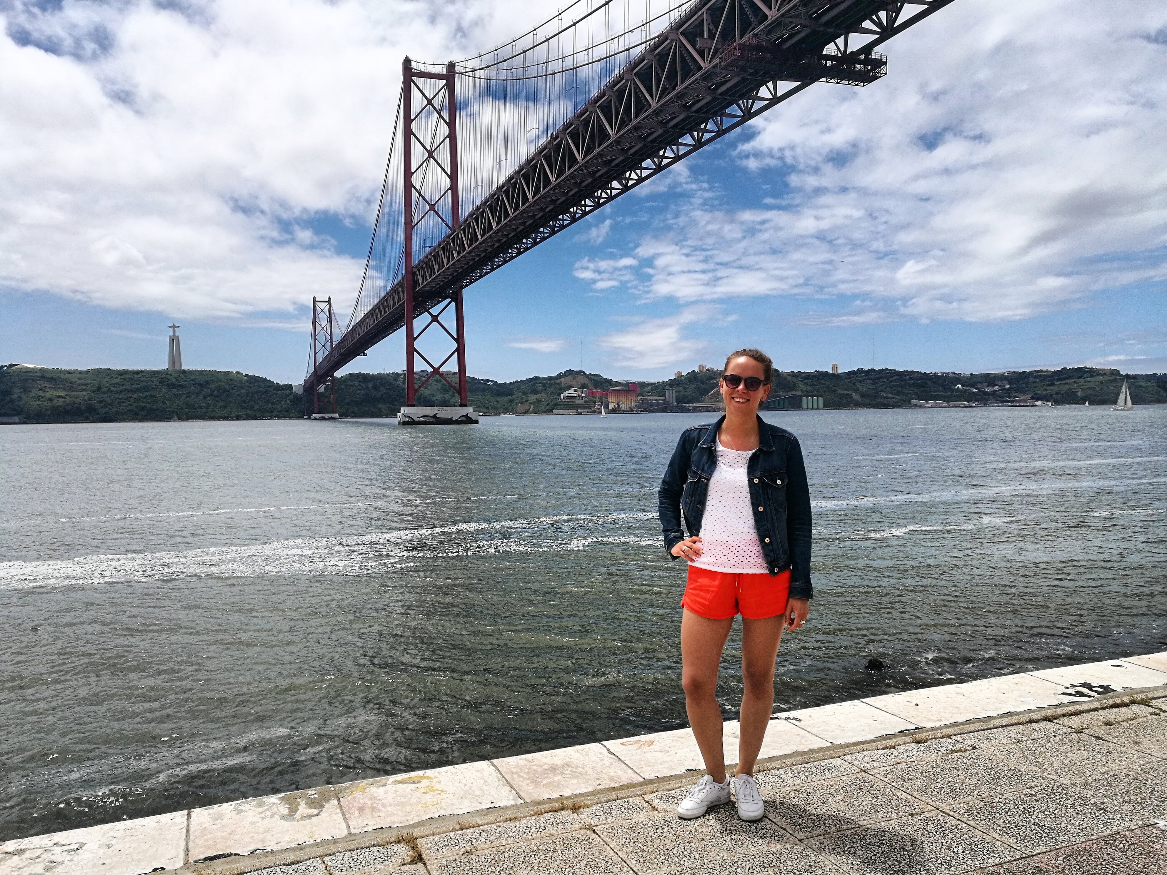 Op mijn laatste dag heb ik mij aangemeld voor fietstour met Baja Bikes, lekker hollands! ’s Ochtends om 10.00 uur verzamelen we en gaan we onder begeleiding van een Nederlandse gids de stad verkennen. Ik hoop natuurlijk dat ik andere plekken ga zien dan waar ik al geweest ben. En ja hoor ik heb geluk, want met de fiets en een tour van bijna 4 uur kom je wel degelijk langs andere spots. Zo maken we een stop voor de Ponte 25 de Abril, één van de bekendste bruggen van Lissabon. Deze brug wordt ook wel de San Francisco brug genoemd. Op de een of andere manier vind ik deze brug fantastisch dus misschien moet ik mij toch maar eens gaan verdiepen in een trip naar Amerika. We fietsen tijdens deze tour veel langs rivier de Taag en tijdens de tour raak ik aan de praat met een meisje die net als ik ook alleen reist. Nog voordat de middag is aangebroken worden we door onze gids getrakteerd op een Ginja, een typisch Portugees drankje. Benieuwd hoe dit smaakt? Waag dan zeker een slokje als je in Lissabon bent! We vervolgen onze tour en eindigen uiteindelijk in de buurt van Torre de Belém. Dit is een verdedigingstoren aan de oever van de rivier de Taag in Belém, een voorstad van Lissabon.